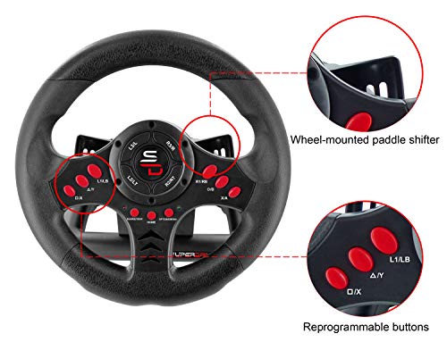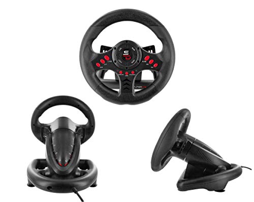 - [Rotación 270, 900 grados] Los botones físicos se pueden girar 270, 900 grados y el funcionamiento es sencillo. 900 grados es adecuado para juegos de conductores como los simuladores de camiones europeos. 270 grados es adecuado para juegos de carreras, como los requisitos de velocidad. Las 7 ventosas y los soportes en forma de C en la parte inferior hacen que el producto sea más seguro, lo que te permite jugar como quieras