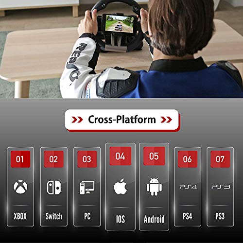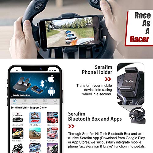 - Serafim R1 + viene con todo lo necesario para disfrutar de sus juegos de carreras al máximo. Esta equipado con un pedal, volante, y soporte para teléfono Serafim innovadora, que le permite jugar juegos de carreras en Xbox One, PS4, PS3, Switch, iOS y Android. Atrás quedaron los días en que había que comprar una rueda separada para cada plataforma.