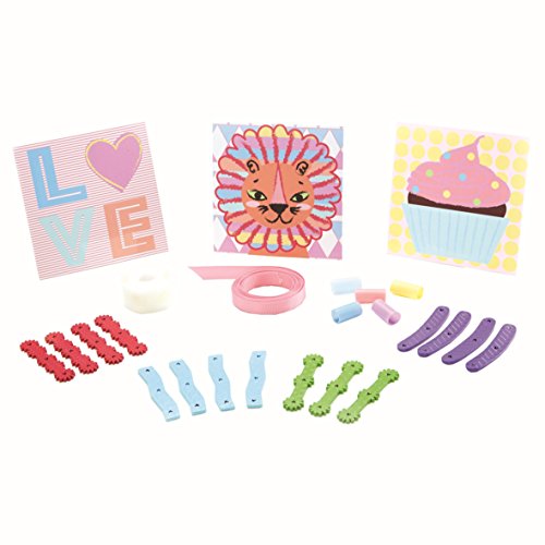 - El juego incluye; 50 pom pom de puntos adhesivos en 5 colores, 60, 18 letra broches de plástico en 4 colores, hilo, 3 tarjetas decorativas y 1 folleto de instrucciones.