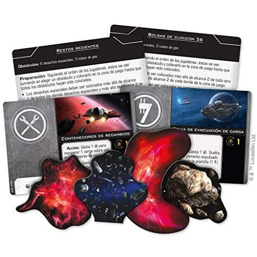 - Además de asteroides, desechos espaciales y nubes de gas, este pack de obstáculos contiene seis cartas de entorno que representan algunos de los extraños y terroríficos lugares donde puede librarse una batalla espacial; cada carta de entorno cambia la colocación o las reglas asociadas a obstáculos, dando mayor variedad a tus partidas de x-wing