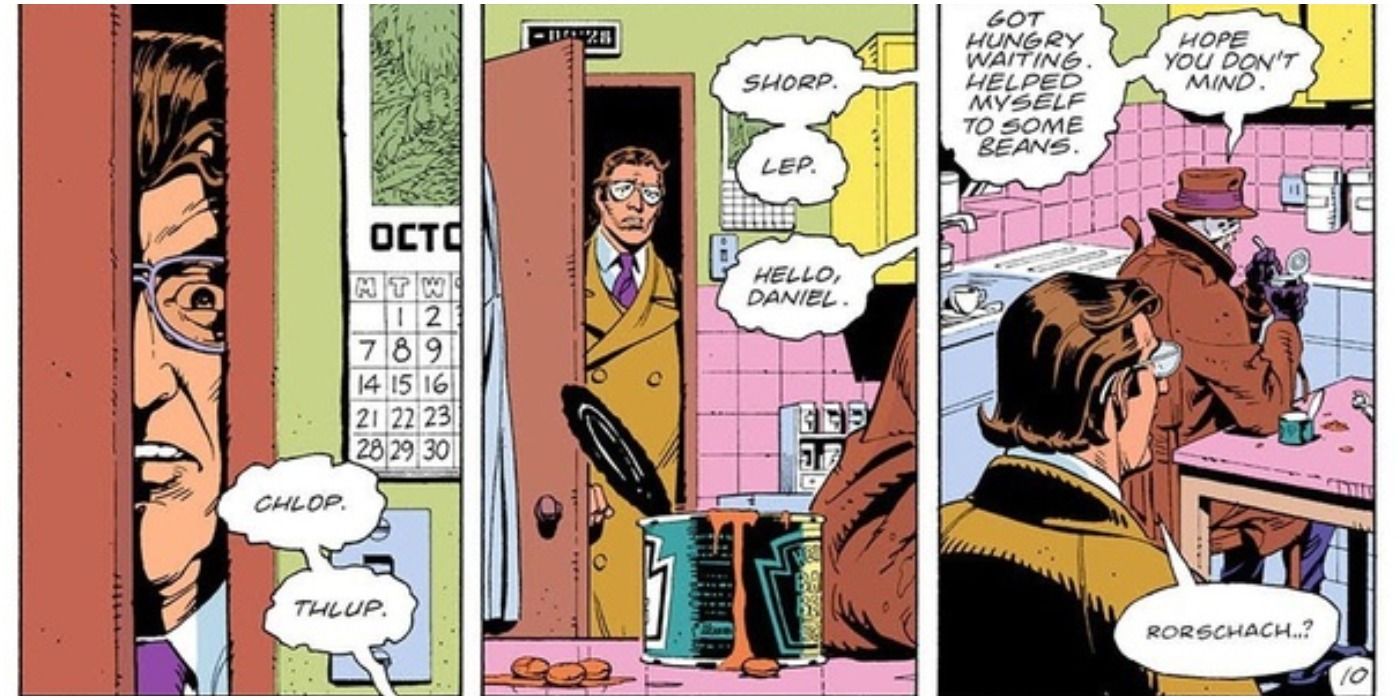 Una de las secuencias más perturbadoras de Watchmen es un flashback en el capítulo 2, donde el primer Silk Spectre (Sally Jupiter) es violado por su compañero de equipo de los "Minutemen" Edward Blake. Cuando la hija de Júpiter/el 2º (retirado) Espectro de Seda lleva esto a Rorschach en el capítulo 1 (cronológicamente más tarde pero secuencialmente más temprano), descarta el incidente como un mero "lapsus moral". Aunque no llega a decirlo directamente, el hecho de que Rorschach se refiera a la anciana Srta. Júpiter como una "puta" más tarde podría significar que la culpa de su propio asalto.