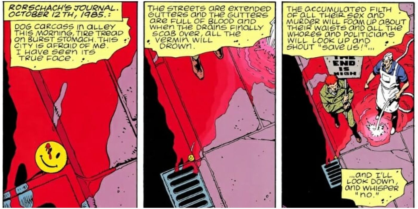 Watchmen demuestra a lo largo de su narración lo que un hombre repugnante Edward Blake, alias el Comediante, era. Sin embargo, Rorschach idolatraba al hombre, tanto por su carrera de vigilante disfrazado como por su "servicio" (léase: crímenes de guerra en nombre de la administración Nixon) en Vietnam.