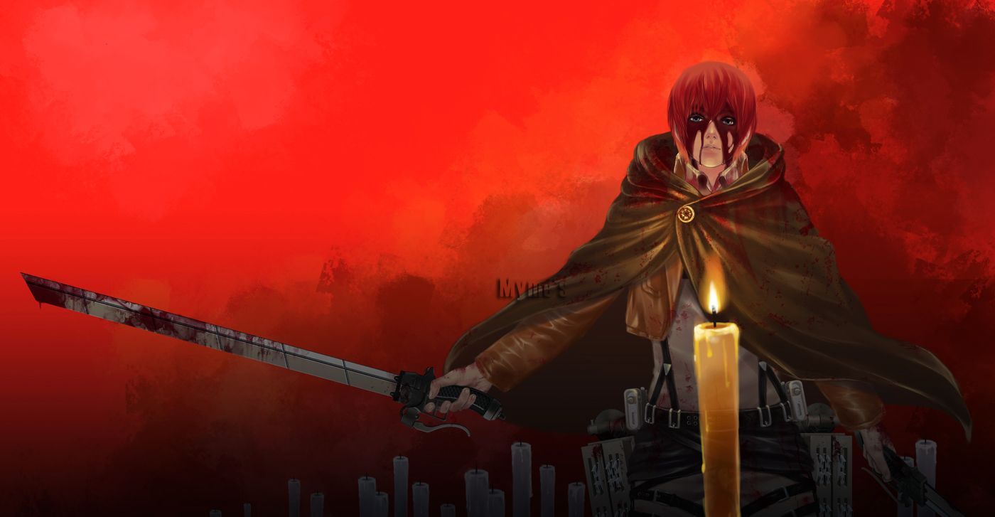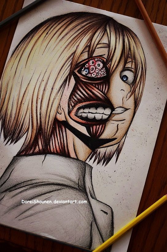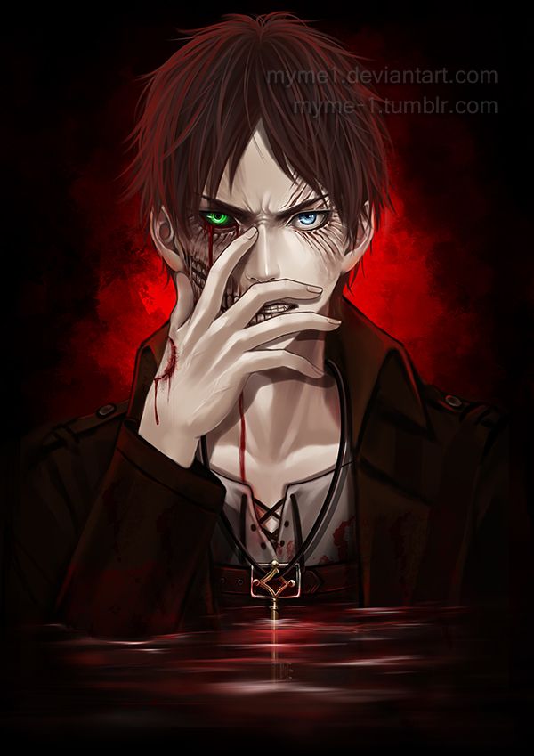 Myme1 sabe cómo hacer una oscura pieza de arte, capturando el tono de la serie. Aquí pueden ver al usualmente tímido y sumiso Armin, que se ve totalmente a cargo. No hay ni una pizca de indecisión en sus ojos, sólo una confiada sed de sangre o sadismo. Parece que disfrutaba matando a quienquiera que fuera, muerto al significado de la vida y la muerte.
