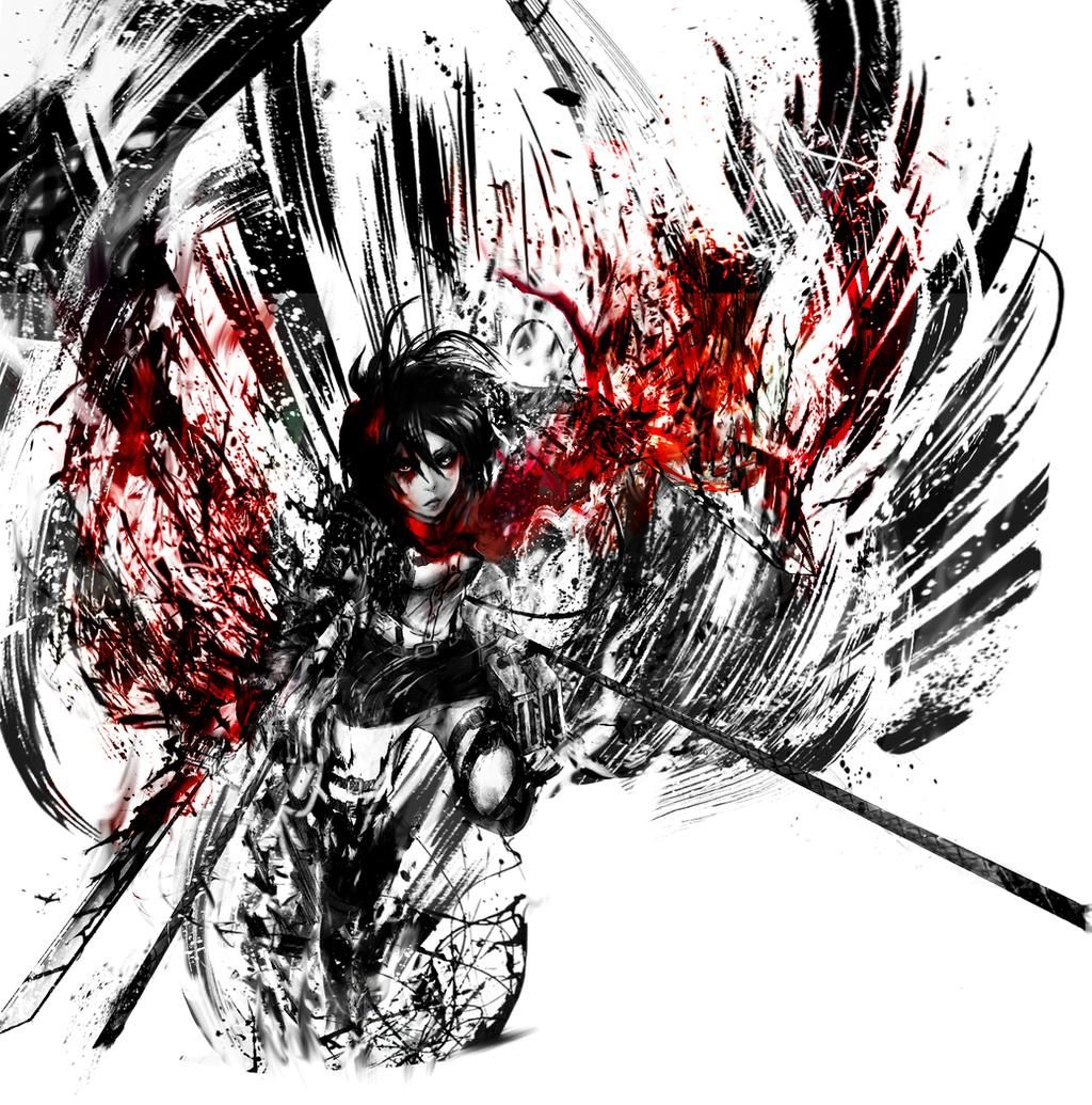 Es un estilo que raramente se ve, algo que se vería increíble en una camiseta blanca. La forma en que su bufanda se rocía de ella como la sangre, al igual que su espada, está increíblemente hecha. Es una obra tan intrincada que muestra cómo se vería Mikasa si alguna vez se desquiciara.