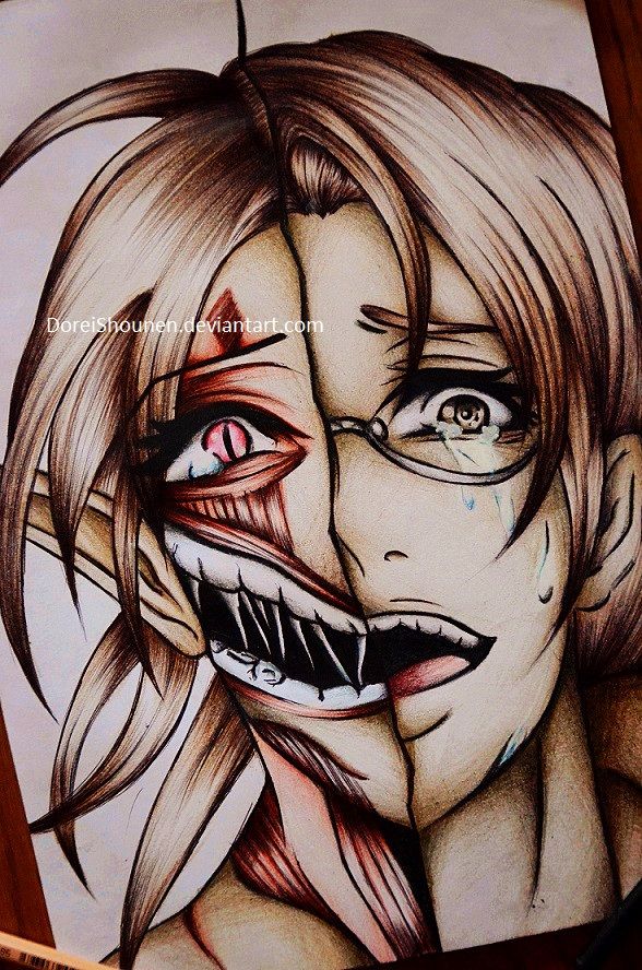 Hay mucho que me gusta de este fan art de Myme1. En primer lugar, el arte en sí es impecable. Desde la forma en que su piel se pela y se retuerce cerca de sus ojos hasta cómo los dientes van tomando lentamente la misma forma que su titán. La mordedura sangrante y destrozada de su mano es increíblemente espeluznante también.