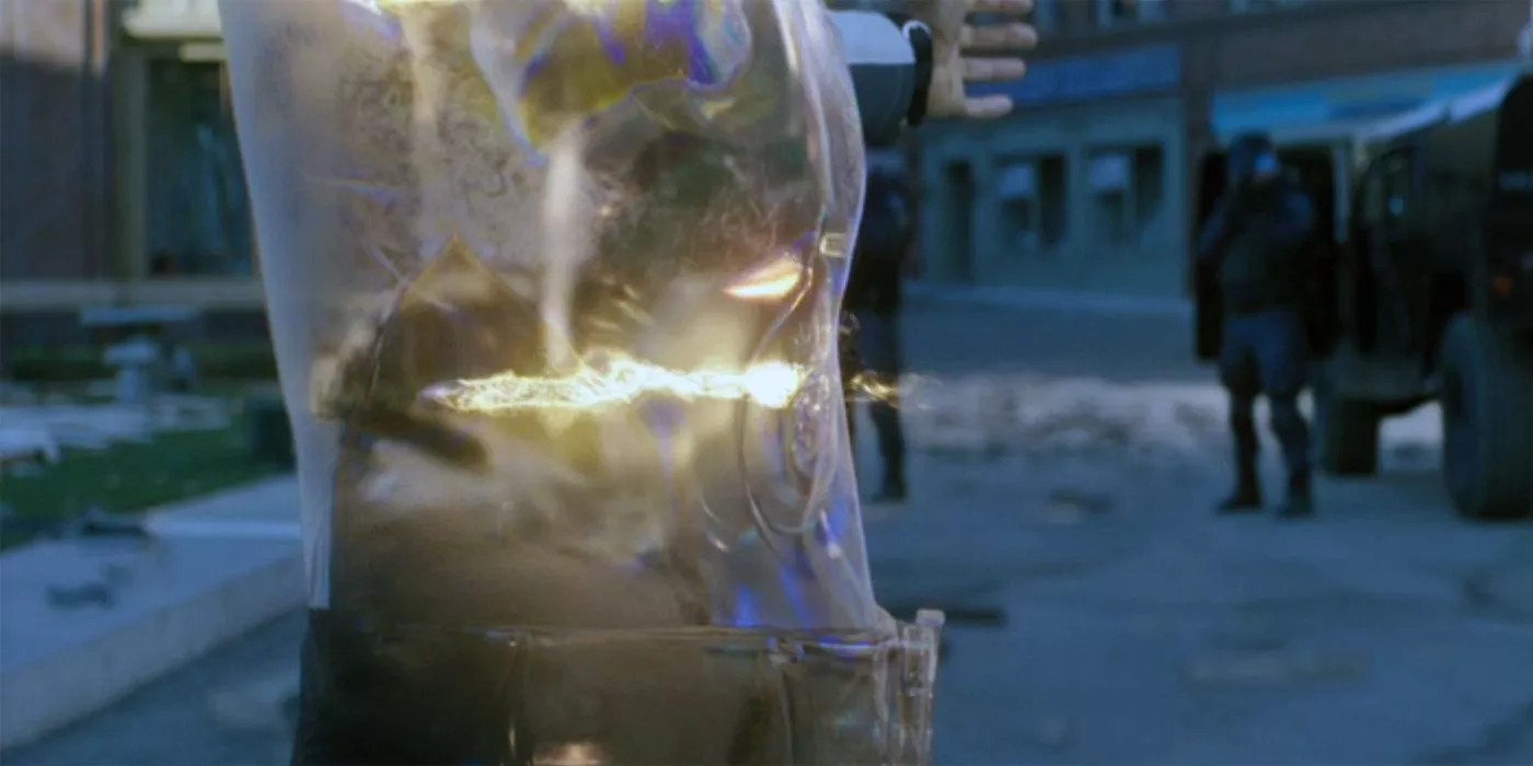En el final, las habilidades más impresionantes de Mónica aparecen justo a tiempo para salvar a los hijos de Wanda. Al percibir que las balas se mueven a cámara lenta, se lanza frente a los disparos, convirtiéndose en un ser de energía pura, de modo que las balas la atraviesan inofensivamente, quitándoles el impulso cuando salen de ella.