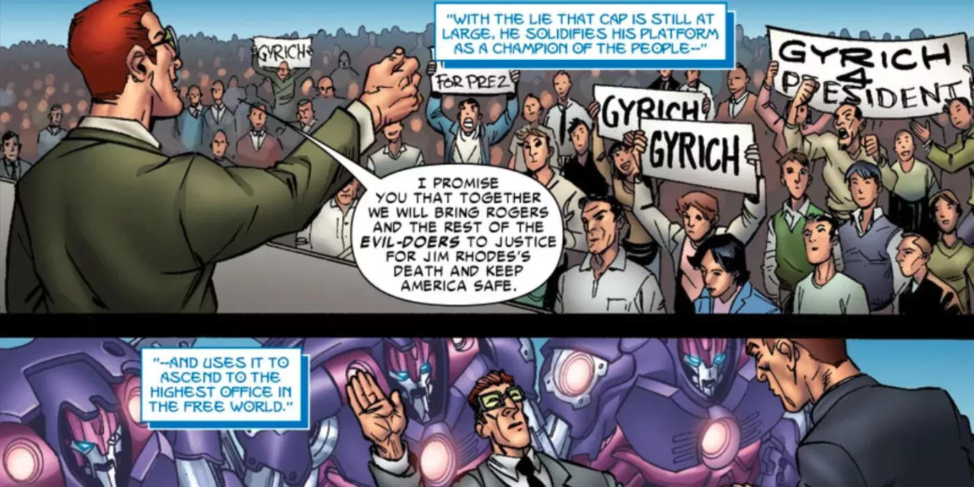 Sin Iron Man cerca para intentar encontrar un punto intermedio pacífico, el gobierno recurre rápidamente a desatar centinelas contra los héroes reunidos, matando a muchos de ellos en poco tiempo. El Capitán América conduce a los héroes restantes a la clandestinidad, donde su resistencia hace lo que puede contra los centinelas controlados por el gobierno. Pero no pasa mucho tiempo antes de que los héroes sean traicionados por María Hill, lo que provoca la erradicación secreta de los héroes restantes (que se oculta al público) y la exitosa elección presidencial de Henry Peter Gyrich.