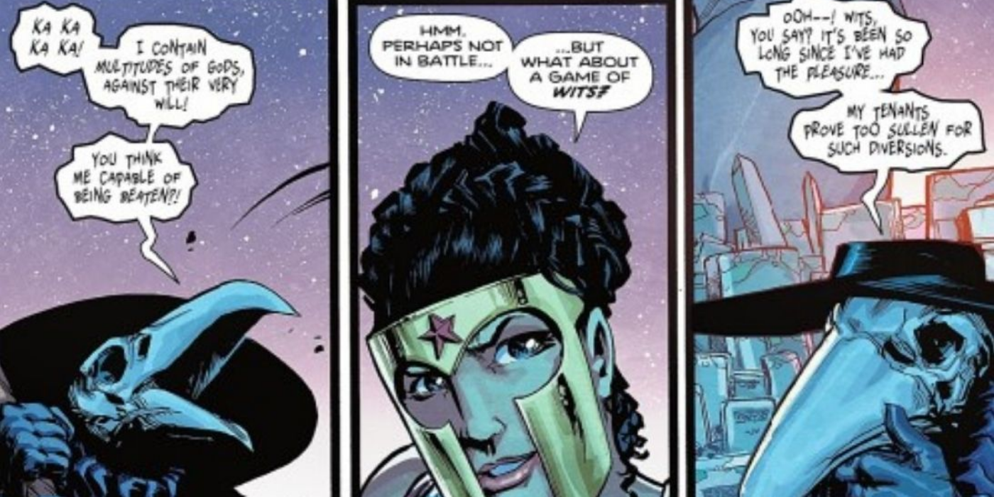 La Mujer Maravilla respondió con éxito a tres acertijos, superando así la prueba y asegurando la liberación de los dioses griegos. Sin embargo, aún había que pagar un coste por viajar a través de la tierra de los muertos, conocido como el Óbolo de Caronte (una referencia a la moneda entregada a Caronte el barquero en las creencias paganas griegas). Tenía que dejar a alguien atrás, así que eligió al dios Caos, el más antiguo de todos los dioses. Aunque no dudó en dejar a Caos en el cementerio, la Mujer Maravilla susurró un juramento de que redimiría a la imprevisible deidad. Sin embargo, en la práctica, su decisión fue definitiva, condenando a Caos a estar siempre atado a la muerte.