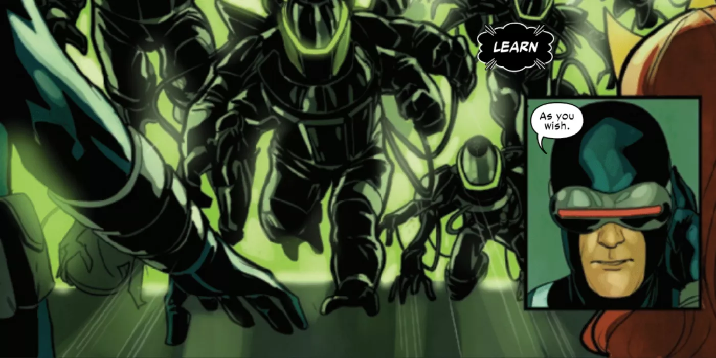 La referencia es genial por un par de razones: Primero, sugiere que el normalmente serio Cíclope ha visto y disfrutado la película clásica y atemporal. Escrita por William Golding basada en su propio libro del mismo nombre y dirigida por Rob Reiner, La Prin cesa Novia se abre con un abuelo que lleva un libro a la casa de su nieto enfermo. Al chico no le interesa, pero el abuelo sigue adelante y presenta a Westley y Buttercup. Ella le da órdenes a Wetsley y con cada orden, su única respuesta es: "Como quieras". Pero pronto, se da cuenta de que, "Cuando decía, 'Como quieras', lo que quería decir era, 'Te quiero'".