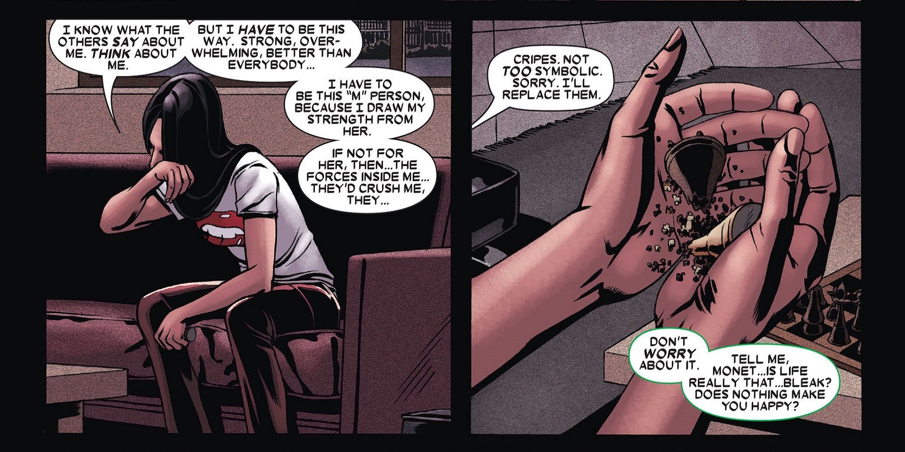 Monet St. Croix, más conocida por sus nombres en clave M o Penance, está claramente mirando de reojo a Synch después de que se anuncie su ingreso en los X-Men. Por muy sorprendente que pueda ser ver una grieta en la fachada de la solidaridad krakoana, es algo completamente propio de M.