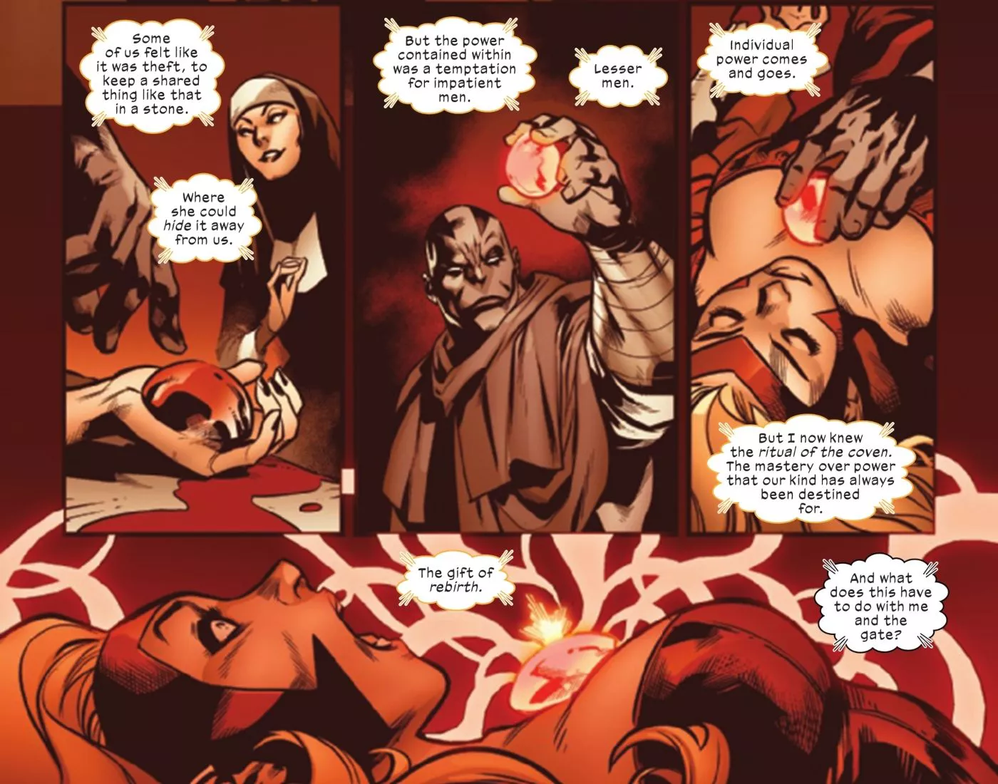 Al colocar la piedra de nuevo en el cuerpo de Chandra, se revitalizó - todavía inmortal, pero desconectada de los externos. Renació, lo que se convirtió en la forma ideal de Apocalipsis para que los mutantes tomaran el control del mundo. Aunque no haya obtenido su poder, Apocalypse aprendió un ritual para lograr el renacimiento y el poder de la restauración. Como alguien que ha sido "asesinado" varias veces a lo largo de los siglos sólo para encontrar siempre una manera de ser restaurado, esto podría verse como la fuente de la creencia de Apocalipsis de que la resurrección es la clave para la supervivencia de los mutantes. Y explicaría por qué Krakoa, con los Cinco ahora capaces de restaurar cualquier mutante derribado en batalla, sería suficiente para influir en Apocalypse y ganarse su lealtad.