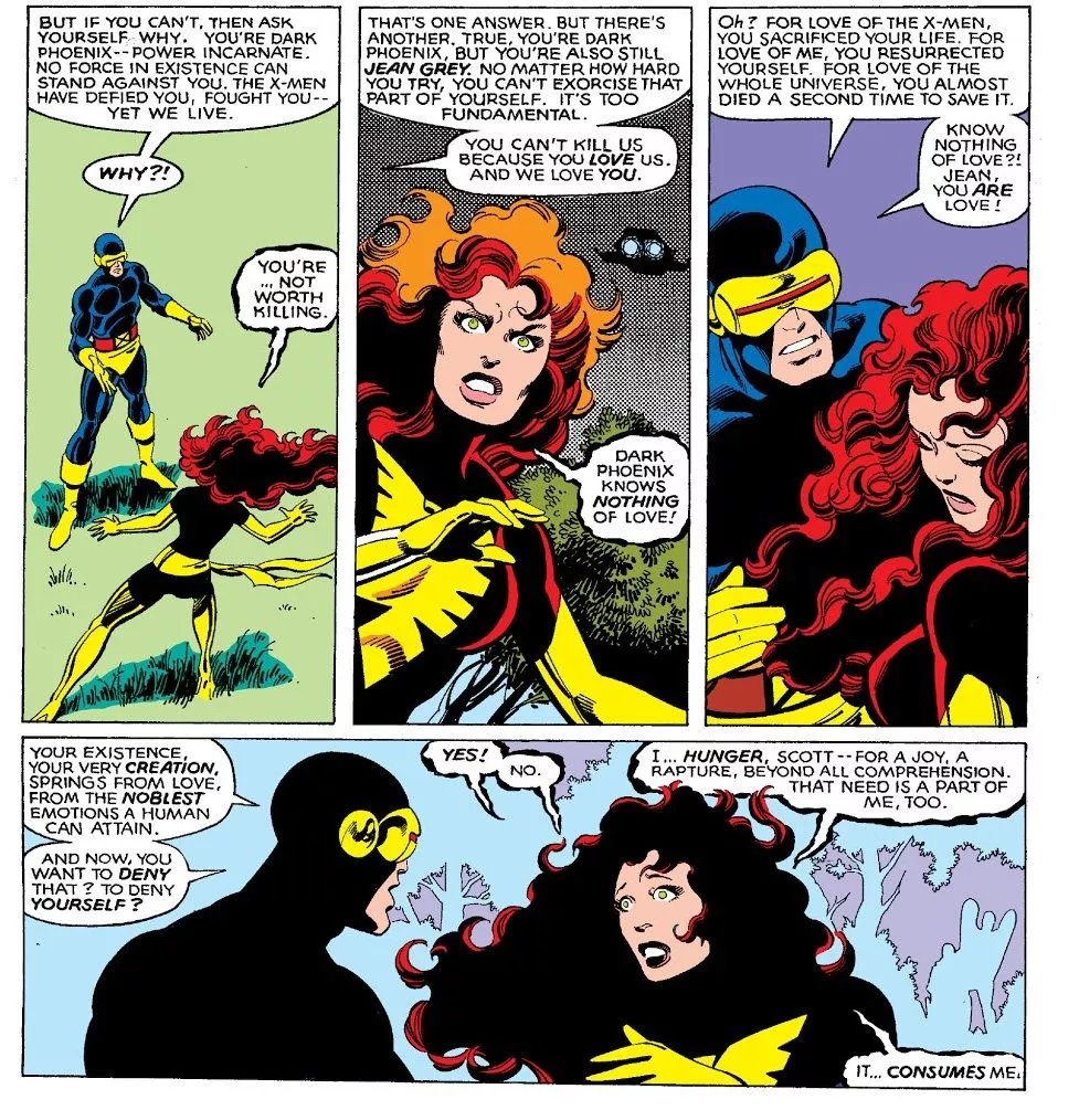Una secuencia de X-Men #136 también se presenta en un nuevo contexto, gracias a la entrevista. La escena tenía a Cíclope acercándose a Fénix Oscura después de que ésta hubiera conseguido capturar al resto del equipo. Apela a su humanidad, utilizando su vínculo para convencer a Jean de que deje de luchar contra sus amigos. Casi la ha convencido cuando el Profesor X llega y la embosca con un ataque telepático sorpresa. Esto hace que la personalidad malvada de Phoenix se reafirme.