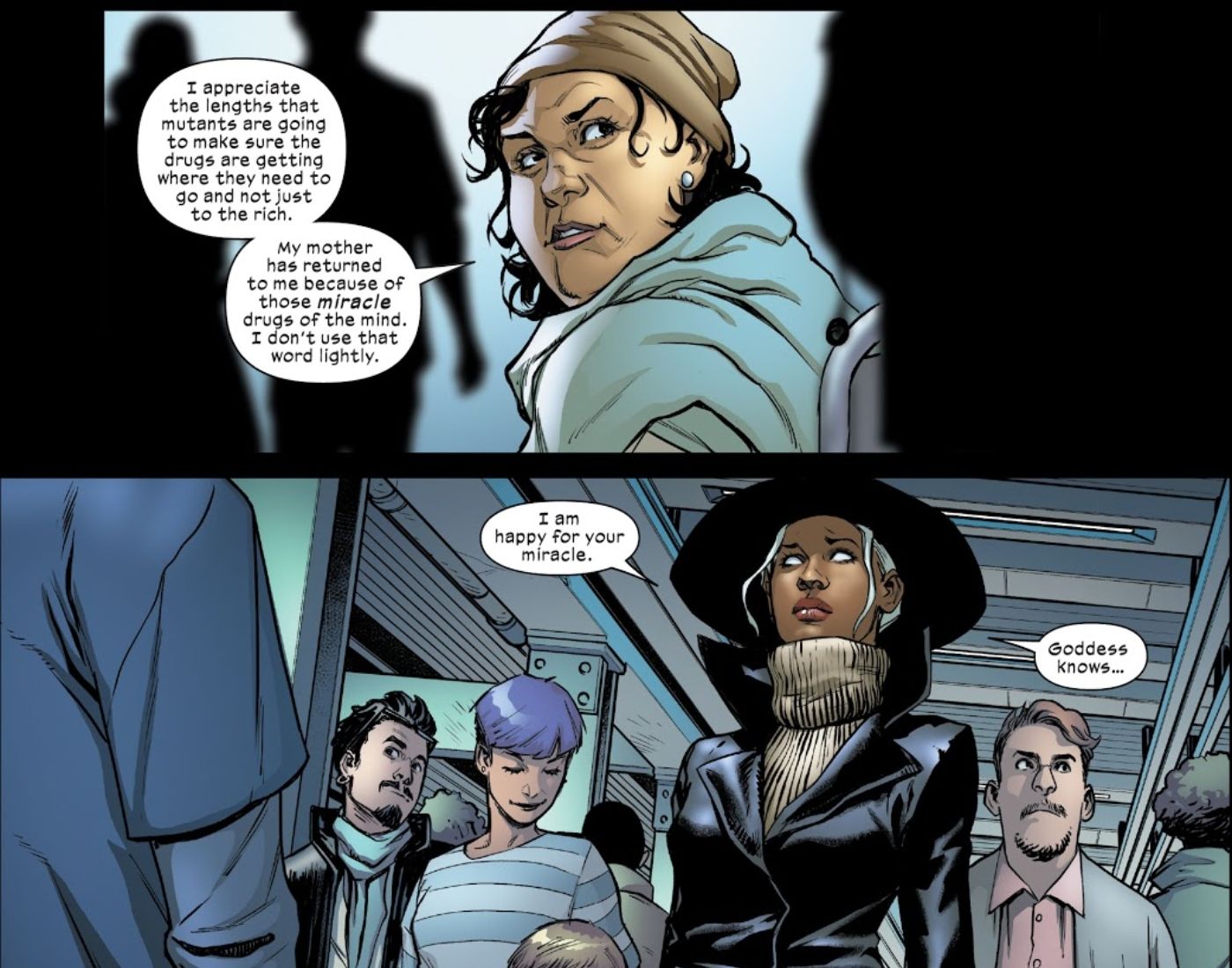 Esto dio lugar a que Verendi llevara accidentalmente medicina sana a personas necesitadas. Y al detener esta medicina falsa, los Marauders también impidieron un plan para incriminar a Krakoa por un incidente internacional. RamÃrez se rÃe rápidamente de esto, y le dice a Storm que también está agradecida por los X-Men; por la medicina de Krakoa que han lanzado, la madre de Delores ha curado sus problemas mentales. Dada la carta que Delores envÃa a sus compañeros después de la reunión, Delores dejó la situación impresionada con los X-Men y los Marauders. Esto hace que el segundo aliado que los X-Men han encontrado recientemente en la CIA: Wolverine trabajó recientemente con Jeff Bannister para detener a la Chica Pálida y rescatar a la hija del agente.