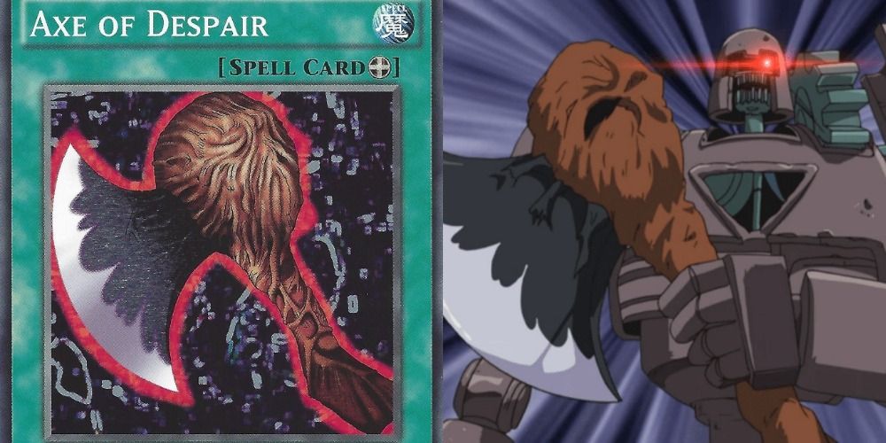 Antes de que monstruos como el Caos cambiaran el paisaje de cómo se juega a Yu-Gi-Oh! y los monstruos de Efecto fueran mucho menos comunes y menos poderosos, Hacha de la Desesperación fue el hechizo de Equipamiento para aumentar el poder ATK de tu monstruo. Desafortunadamente, a pesar de lo fuerte que es el efecto de aumentar el ATK de un monstruo en 1000 puntos, se ve obstaculizado por el hecho de que tiene que permanecer en el campo para que su efecto permanezca, lo que significa que el Hacha de la Desesperación es un objetivo muy fácil para los efectos de eliminación de Hechizos y Trampas.