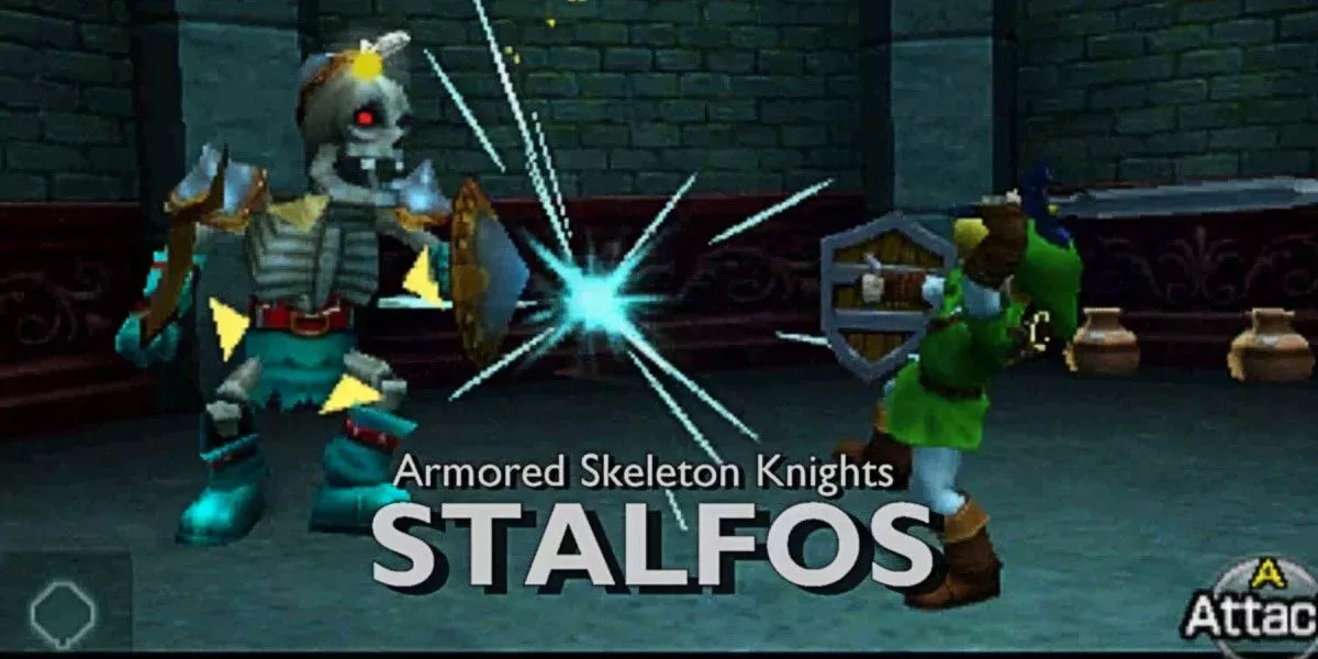 Los Stalfos son los muertos vivientes esqueléticos de la serie Zelda , que aparecen en casi todos los juegos desde el primero. Su diseño no ha cambiado demasiado a lo largo de los años y, en general, siempre han sido presentados como un enemigo más. Eso cambió con Ocarina of Time, donde al hablar con un Kokiri fuera del Bosque Perdido se revela que cualquiera que se pierda en el bosque se convertirá inevitablemente en un Stalfos. Es una revelación escalofriante, más aún si se combina con el hecho de que los esqueletos que aparecen repetidamente en el Campo de Hyrule por la noche se llaman Stalchildren, no Stalfos, lo que implica que son niños que se han perdido en el bosque.
